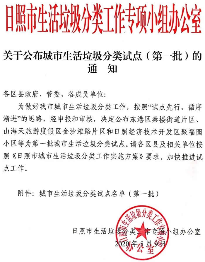 5月9日,日照市生活垃圾分類工作專項(xiàng)小組辦公室,公布首批城市生活垃圾分類試點(diǎn)