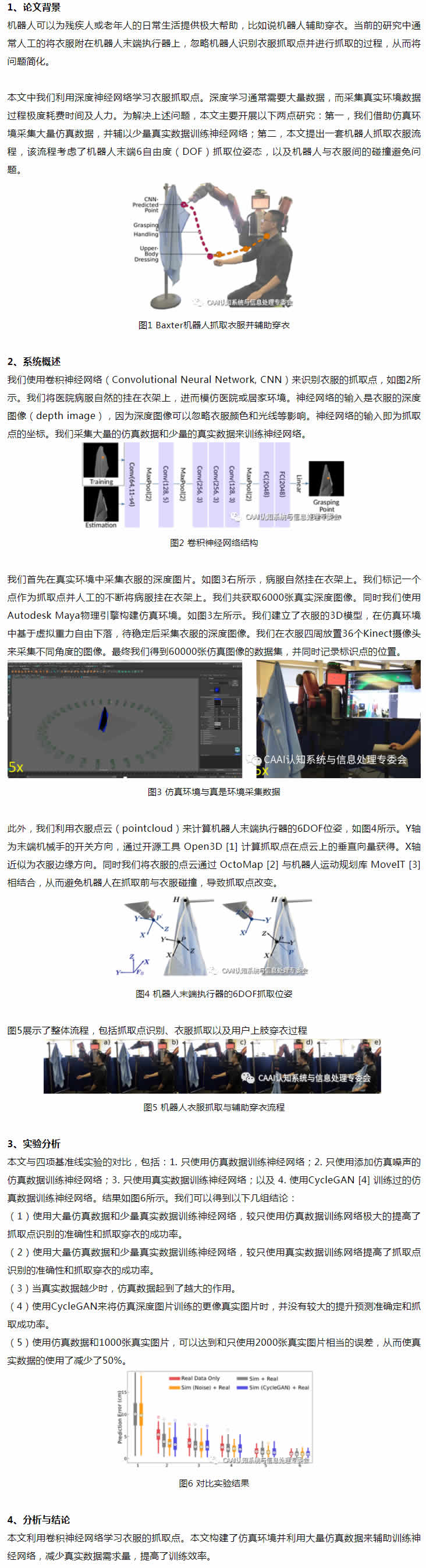 機器人可以為殘疾人或老年人的日常生活提供J大幫助,比如說機器人輔助穿衣。當前的研究中通常人工的將衣服附在機器人末端執行器上,忽略機器人識別衣服抓取點并進行抓取的過程,從而將問題簡化。