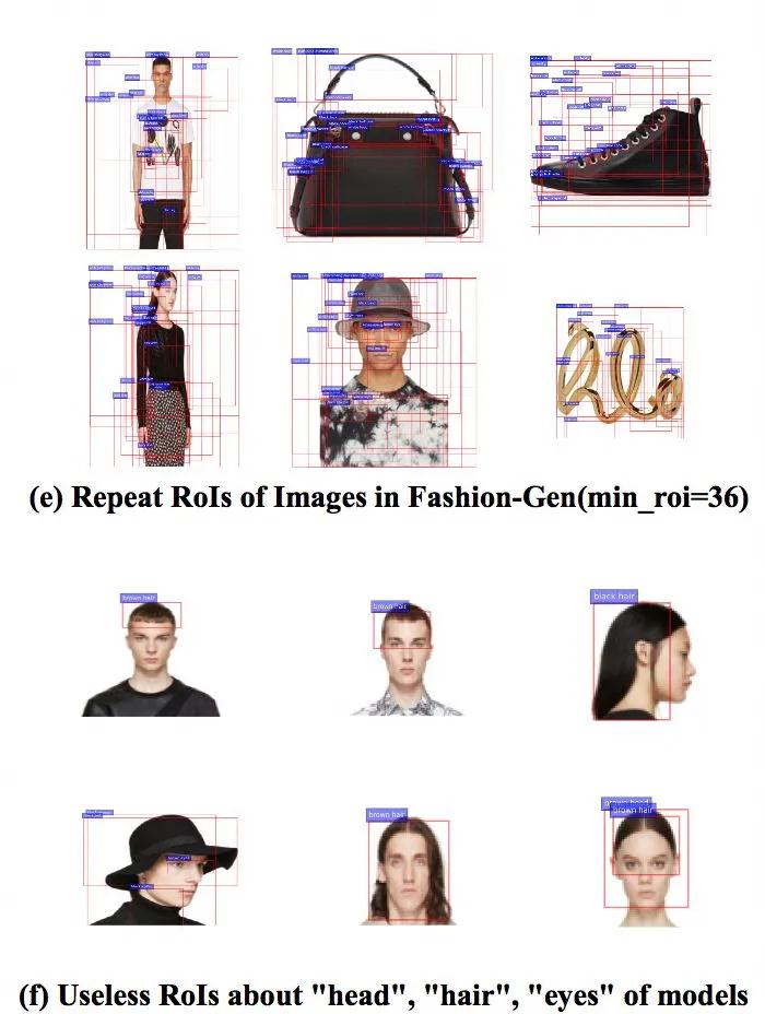 電商圖像產品單一,背景簡單提取 ROI 很少,如圖 1(c)。統(tǒng)計來看,通用L域 MsCoCo 數(shù)據(jù),每張圖像可以提取 19.8 個 ROI,但是電商只能提取 6.4 個 ROI。當然我們可以強制提取小的 ROI,比如 ViLBERT 要求在 10~36 個,VLBERT 要求 100 個。但是當設定小提取的 ROI 后,又提取了太多了重復的 ROI,可以看圖 1(e)。