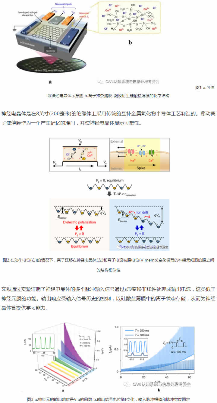 神經形態結構融合學習和記憶功能L域的研究主要集中在人工突觸的可塑性方面,同時神經元膜的固有可塑性在神經形態信息處理的實現中也很重要。德國德累斯頓大學聯合清華大學北京未來芯片創新中心腦靈感計算研究中心(CBICR)近期發表了一篇名為“Intrinsic plasticity of silicon nanowireneurotransistors for dynamic memory and learning functions”的論文,文獻提出一種由矽奈米線電晶體制成的神經電晶體,表面覆有離子摻雜的溶膠-凝膠硅酸鹽薄膜,從而模擬神經元薄膜的固有可塑性。