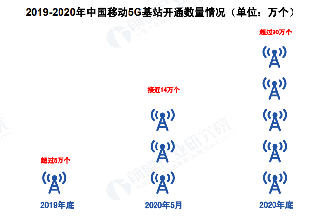 在2020年6月6日,工信部新聞宣傳中心舉行的“5G發牌一周年”線上峰會上,中國移動表示目前已開通近14萬個5G基站,并將加快網絡建設,確保年內累計建成30萬個5G基站,實現在全國所有地級以上城市提供5G商用服務,夯實經濟社會數字化轉型的網絡基礎。