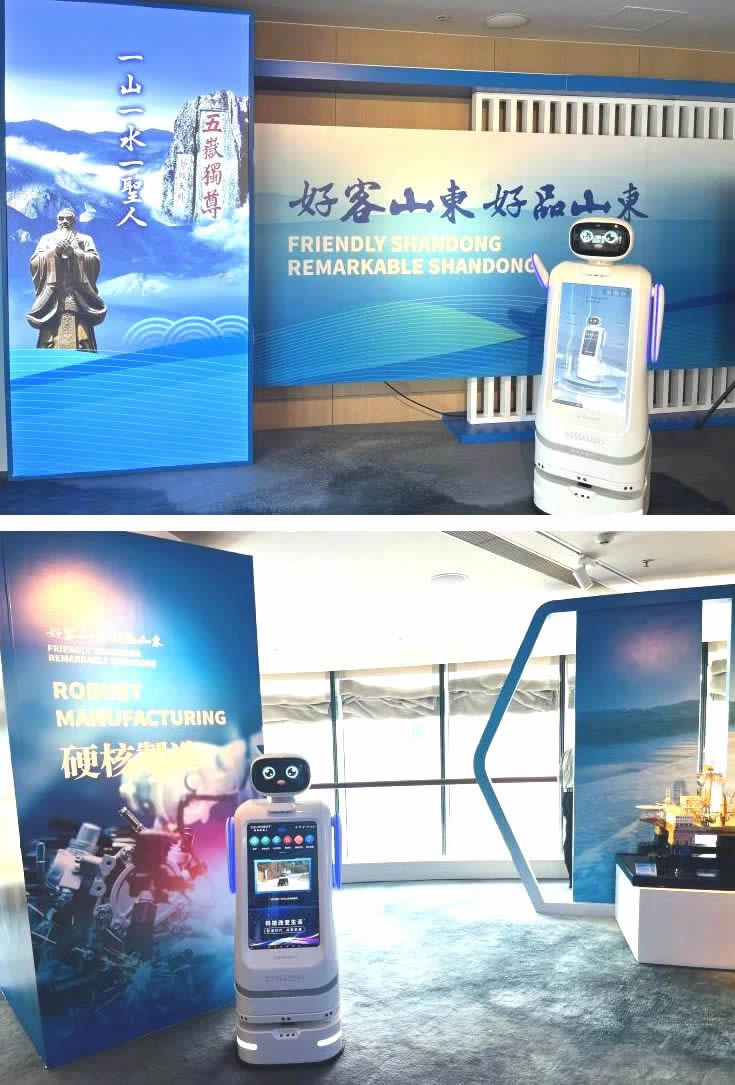 5月27日下午,在“好客山東 好品山東”展區,類人型智能服務機器人“創創”作為主題墻1號展品熱情迎接了全國政協副主席梁振英、省委書記林武等與會L導和嘉賓。