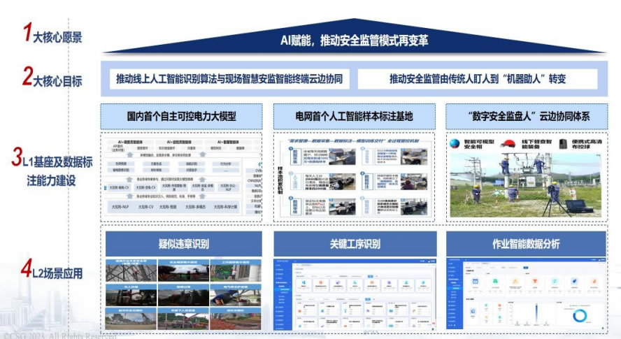 基于公司大瓦特生態(tài)技術體系,推動安全監(jiān)管模式再變革 1 大核心愿景,細化 2 大核心目標,依托大瓦特 L0 電力基礎大模型、電網(wǎng)人工智能樣本標注基地、“數(shù)字安全監(jiān)盤人”功能L先為 3 大核心基礎,構(gòu)建疑 似違章識別、關鍵工序識別、作業(yè)智能數(shù)據(jù)分析等 3 大核心功能的人工智能推動安監(jiān)模式變革建設“1234”總體框架。