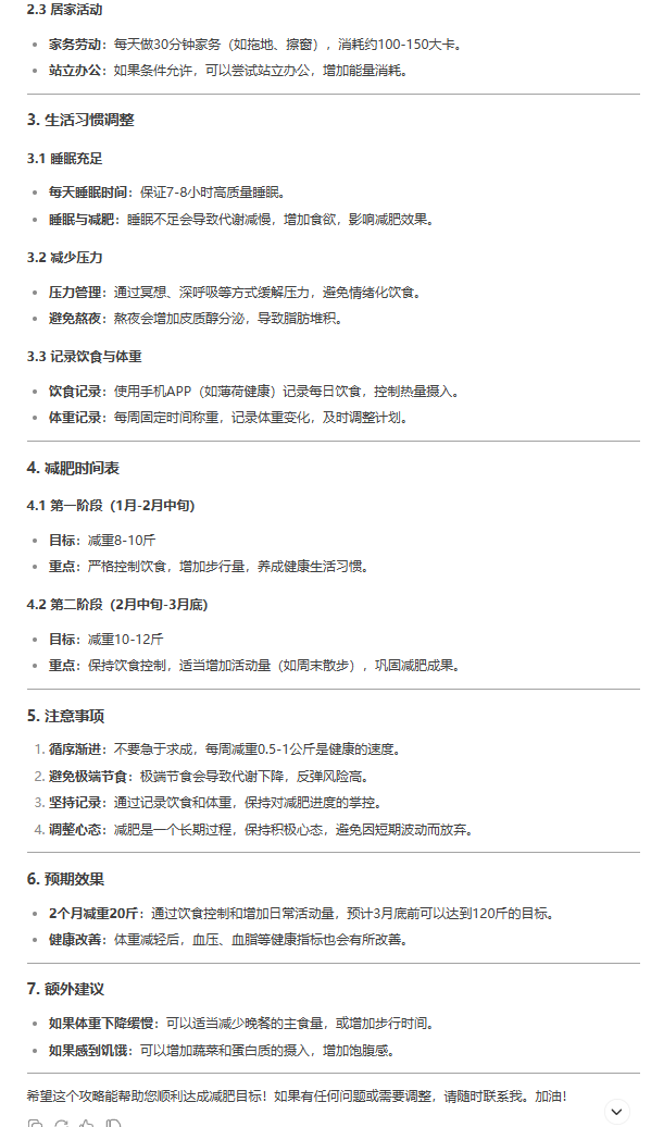我是曾英杰,男,40 歲,140 斤,我想在 3 月底之前,控制體重到 120 斤。我討厭運(yùn) 動,家里到公司大概 2 公里。幫我制定一個減肥攻略