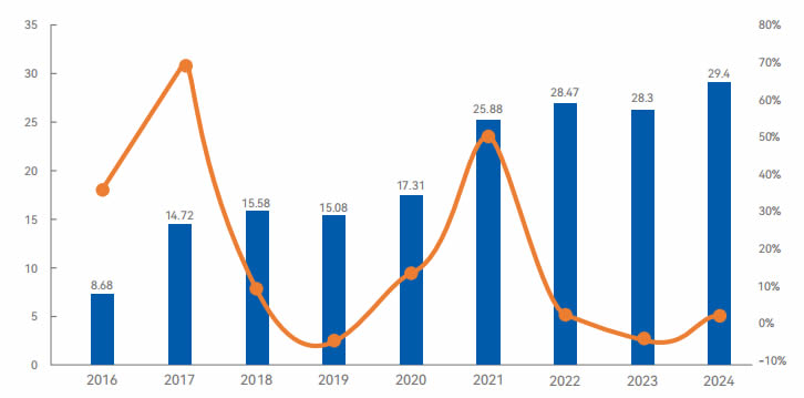 2024年全年,ZG工業(yè)機(jī)器人市場銷量超29.4萬臺。盡管受整體制造業(yè)企業(yè)生產(chǎn)預(yù)期下降、市場需求收縮等因素影響,工業(yè) 機(jī)器人面臨著一系列的增長壓力,市場仍處于去庫存和行業(yè)淘汰賽的關(guān)鍵階段,但同比2023年仍實現(xiàn)3.9%的微增。
