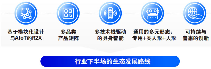 開放性的全棧式智能服務(wù)機(jī)器人生態(tài)的發(fā)展 路線是一個多維度、跨領(lǐng)域的綜合性戰(zhàn)略, 進(jìn)入行業(yè)下半場 ,服務(wù)機(jī)器人正沿著一條創(chuàng) 新的發(fā)展道路前進(jìn) 。這條道路的實(shí)現(xiàn)需要依 靠多種戰(zhàn)略的發(fā)展 ,其中包括了以模塊化設(shè) 計(jì)和AIoT技術(shù)為基礎(chǔ) ,構(gòu)建起R2X (Robot-to- Everything),即機(jī)器人與萬物互聯(lián),使得機(jī)器 人能夠靈活地與周圍環(huán)境和設(shè)備進(jìn)行交互。在 這一生態(tài)中 ,專用、類人形和人形機(jī)器人三種 形態(tài)相輔相成 ,不可替代 ,共同構(gòu)成了機(jī)器人 行業(yè)的未來生態(tài) ,以適應(yīng)各種場景和任務(wù)。而 這背后 ,是多技術(shù)棧的驅(qū)動力 ,它們集成了自 主移動、操作和交互等關(guān)鍵技術(shù) ,賦予機(jī)器人