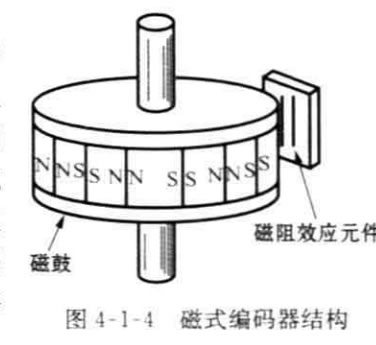 磁式編碼器是通過在強磁性材料表面上等 間隔的磁化刻度標尺,標尺旁邊相對放置磁阻 效應(yīng)元件或霍爾元件,即能檢測磁通的變化,如 圖4-1-4所示,兩個磁傳感器的距離恰好是磁化 標尺間隔的1/4. 因此可以根據(jù)輸出信號的相位 關(guān)系檢測旋轉(zhuǎn)方向。與光學(xué)編碼器相比,磁式編 碼器的刻度間隔大,但它具有耐油污、抗沖擊等 特點。