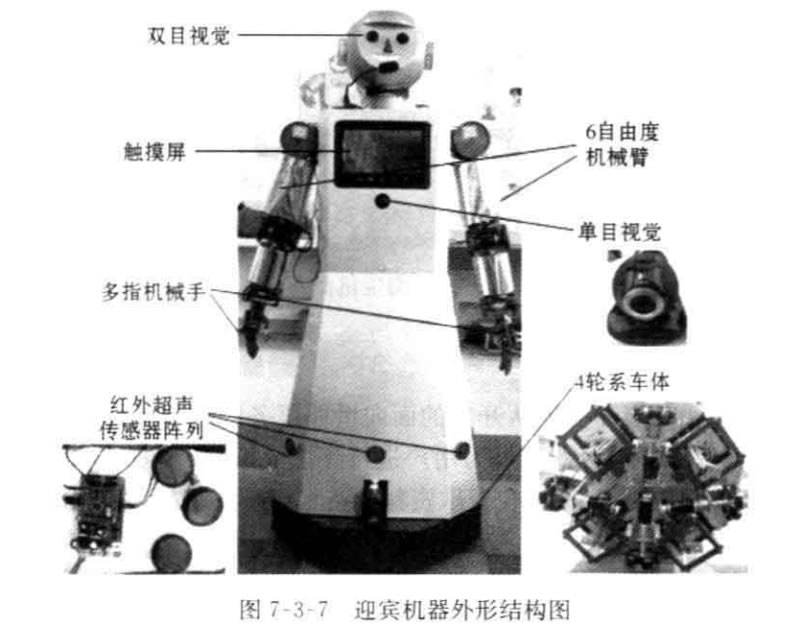 迎賓機器人采用造型活潑的卡通形象,其外形如圖7-3-7所示,頭部有雙目視覺傳感器,身體部分主要包括觸摸屏、機械臂和機械手。身高約1.4~1.5m, 采 用 輪式移動方式,Z高移動速度約18m/min 。 可自主完成接待、導引、語音提示、點 菜等服務工作。連續工作時間不小于2小時。主要參數如下: