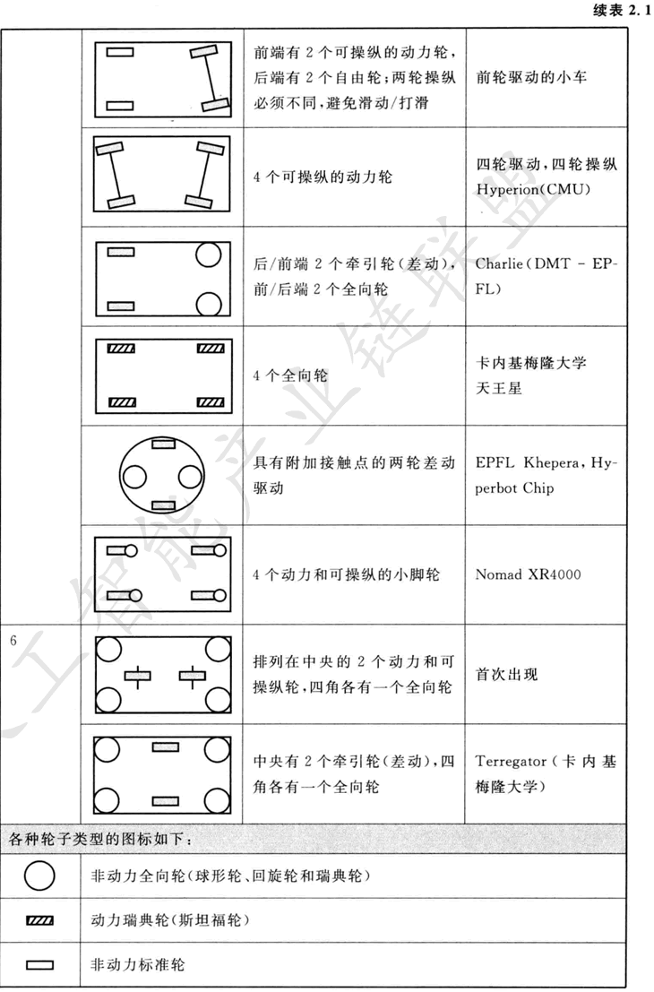 表2.1給出了輪子結構的概貌,按輪子數目排序。表中描述了特殊輪子類型的選擇和機器人底盤上它們的幾何結構這兩個方面。我們注意到,所示的某些輪子結構在移動機器人的應用中很少用到。例如,兩輪自行車裝配,其機動性中等,可控性 差。再像單腿跳躍機,它根本不能靜止地站著。不過,表中提供了在運動機器人設計 中可能用到的許多種類輪子結構的說明。
