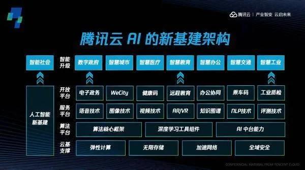 基于騰訊云、企業(yè)微信等社交連接工具,騰訊布局AI新基建全景。騰訊云AI新基建整體布局為“一云三平臺(tái)”架構(gòu)。一云是騰訊云,三平臺(tái)包括算法平臺(tái)、服務(wù)平臺(tái)以及開放平臺(tái)。