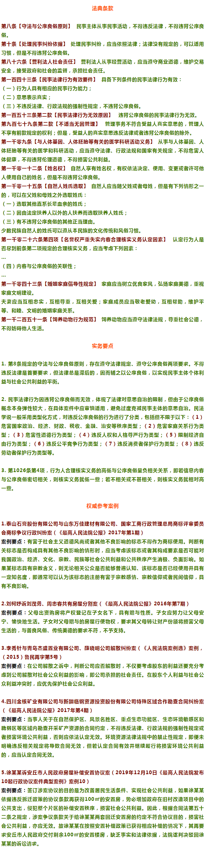 公序良俗是指公共秩序和善良風(fēng)俗,也是民法的基本原則之一。民法通則規(guī)定,民事活動(dòng)應(yīng)當(dāng)尊重社會(huì)公德,不得損害社會(huì)公共利益。實(shí)質(zhì)上就是指公序良俗,只是當(dāng)時(shí)存在較多意識(shí)形態(tài)禁忌,未明確使用公序良俗這一概念。民法總則和民法典立法時(shí)對(duì)此進(jìn)行了突破,明確使用公序良俗這一概念。公共秩序,是指政治、經(jīng)濟(jì)、文化等L域的基本秩序和根本理念,是與國(guó)家和社會(huì)整體利益相關(guān)的基礎(chǔ)性原則、價(jià)值和秩序。善良風(fēng)俗,是指基于社會(huì)主流道德觀念的習(xí)俗,也可稱為社會(huì)公共道德,是社會(huì)成員所普遍認(rèn)可、遵循的道德準(zhǔn)則。