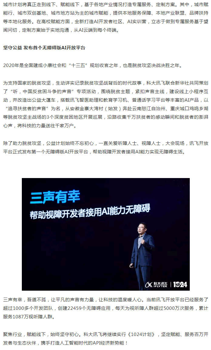 科大訊飛1024計劃全新升級為“AI賦能計劃”,發(fā)布聚焦行業(yè)的先導計劃、賦能線下的城市計劃、堅守初心的公益計劃。“我們將從產(chǎn)品賦能走向行業(yè)賦能,實現(xiàn)進階服務,為生態(tài)和應用的發(fā)展提供更契合的A.I.源動力。” 胡國平表示。