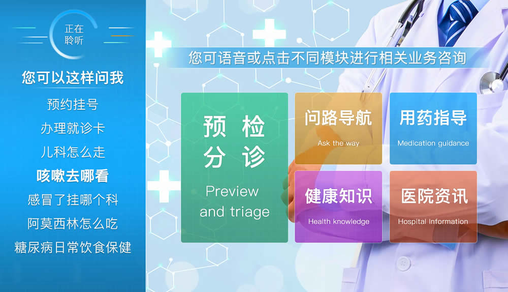 智能導(dǎo)診機(jī)器人開(kāi)發(fā)初衷是解決門(mén)診導(dǎo) 醫(yī)人數(shù)較少、重復(fù)問(wèn)答較多的現(xiàn)實(shí)情況。在醫(yī) 院業(yè)務(wù)G峰期人滿為患的情況下,智能醫(yī)療 服務(wù)機(jī)器人可以及時(shí)響應(yīng),可以指導(dǎo)患者就 醫(yī)、引導(dǎo)分診,同時(shí)向患者可以介紹醫(yī)院就 醫(yī)環(huán)境、門(mén)診就診流程和醫(yī)療保健知識(shí)等。 導(dǎo)診機(jī)器人通過(guò)語(yǔ)音識(shí)別、語(yǔ)音合成和自然 語(yǔ)言理解等技術(shù),支持語(yǔ)音、觸控、圖像等 多種交互方式,改善就醫(yī)體驗(yàn),提G醫(yī)療服 務(wù)質(zhì)量,是醫(yī)院智慧醫(yī)療的重要組成部分和 具體體現(xiàn)。