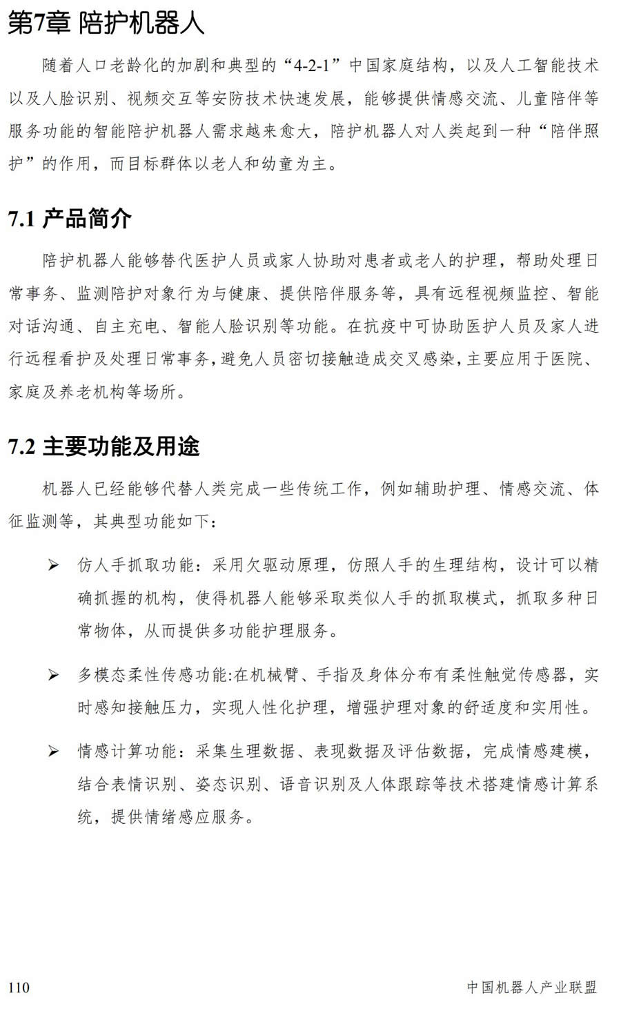 在傳感器、人工智能、大數(shù)據(jù)等技術快速發(fā)展下,陪護機器人將更加的智能化和人性化。如:融合物聯(lián)網(wǎng)、云計算等技術,采用多機器人協(xié)作機制,打造智慧陪護模式,實現(xiàn)多功能協(xié)同的居住空間;通過多傳感器智能感知系統(tǒng),結合語義理解、圖像自動標題、深度行為樹分析模型等技術,使機器人可根據(jù)用戶的表情和手勢指令提供相關服務;能夠主動識別并學習掌握陪護對象習慣、行為和個性, 體察人類情感并建立用戶畫像,進而提供針對性服務;在分級診療制度下,充分利用互聯(lián)網(wǎng)優(yōu)勢,把陪護機器人與社區(qū)、養(yǎng)老院和醫(yī)院有機聯(lián)合在一起,順應醫(yī)養(yǎng)結合大趨勢,運用信息化技術實現(xiàn)“一對多”的新型陪護模式