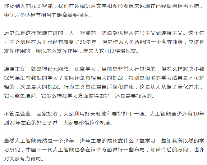 這個(gè)輪廓和布局看起來(lái)很圓滿,但遠(yuǎn)遠(yuǎn)不夠。如果看整個(gè)人工智能學(xué)科的輪廓,包括計(jì)算機(jī)視覺(jué)、語(yǔ)言識(shí)別、自然語(yǔ)言、人機(jī)交互、機(jī)器人學(xué)習(xí)等方向,目前大的布局是沉浸到應(yīng)用這個(gè)方面。