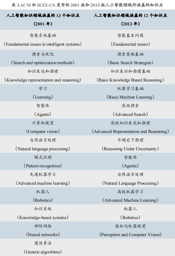 2001 年, ACM 和 IEEE-CS 聯(lián)合工作組發(fā)布了計算機(jī)課程體系 Computing Curricula 2001 OComputing Curricula 2001 將計算機(jī)課程體系分為 14 個知識L域, 其中用“智能系統(tǒng) (Intelligent System) ”來指代人工智能O在這版計算機(jī)課程體系 中, 人工智能知識L域相關(guān)內(nèi)容被分為智能系統(tǒng)基礎(chǔ)、搜索與優(yōu)化、知識表達(dá)和 推理、學(xué)習(xí)、智能體、 計算機(jī)視覺、 自然語言處理、 模式識別、先進(jìn)機(jī)器學(xué)習(xí)、 機(jī)器人、知識系統(tǒng)、神經(jīng)網(wǎng)絡(luò)和遺傳算法等 13 個知識點(diǎn)O從這 13 個知識點(diǎn)可以 看出,人工智能知識L域內(nèi)容基本成型O