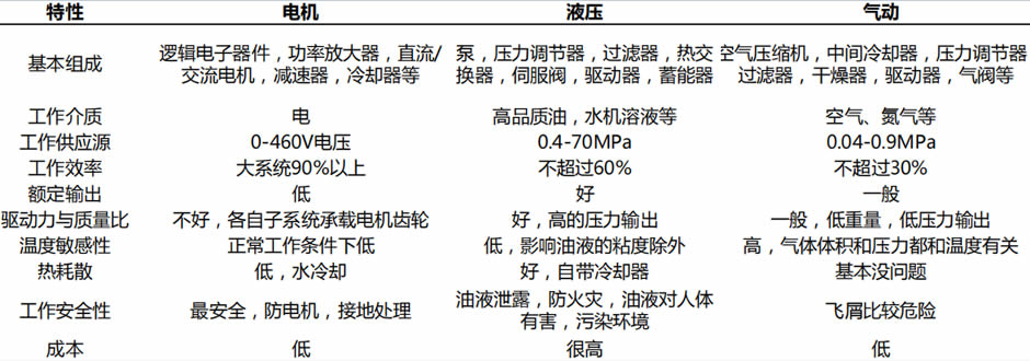 液壓、電機和氣動驅動方式各有特點,其中電機驅動為傳統,技術進步迭代速度快,應用范圍廣;