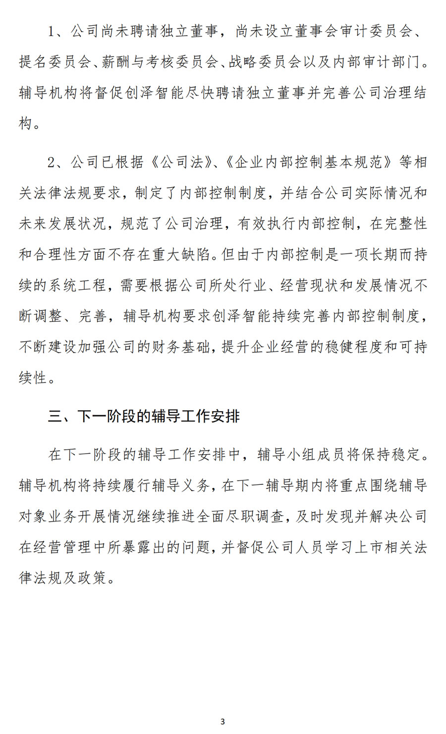 2、公司已根據(jù)《公司法》、《企業(yè)內(nèi)部控制基本規(guī)范》等相關(guān)法律法規(guī)要求,制定了內(nèi)部控制制度,并結(jié)合公司實(shí)際情況和未來(lái)發(fā)展?fàn)顩r,規(guī)范了公司治理,有效執(zhí)行內(nèi)部控制,在完整性和合理性方面不存在重大缺陷。但由于內(nèi)部控制是一項(xiàng)長(zhǎng)期而持續(xù)的系統(tǒng)工程,需要根據(jù)公司所處行業(yè)、經(jīng)營(yíng)現(xiàn)狀和發(fā)展情況不斷調(diào)整、完善,輔導(dǎo)機(jī)構(gòu)要求創(chuàng)澤智能持續(xù)完善內(nèi)部控制制度,不斷建設(shè)加強(qiáng)公司的財(cái)務(wù)基礎(chǔ),提升企業(yè)經(jīng)營(yíng)的穩(wěn)健程度和可持續(xù)性。
