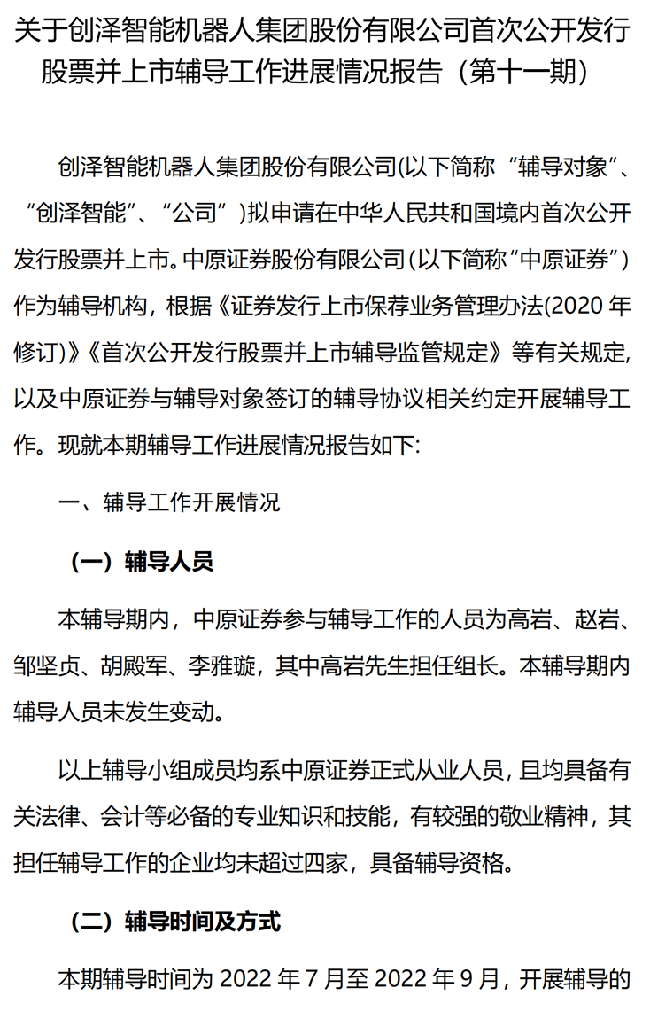 創(chuàng)澤智能機(jī)器人集團(tuán)股份有限公司首次公開(kāi)發(fā)行股票并上市輔導(dǎo)工作進(jìn)展報(bào)告(第十一期)
