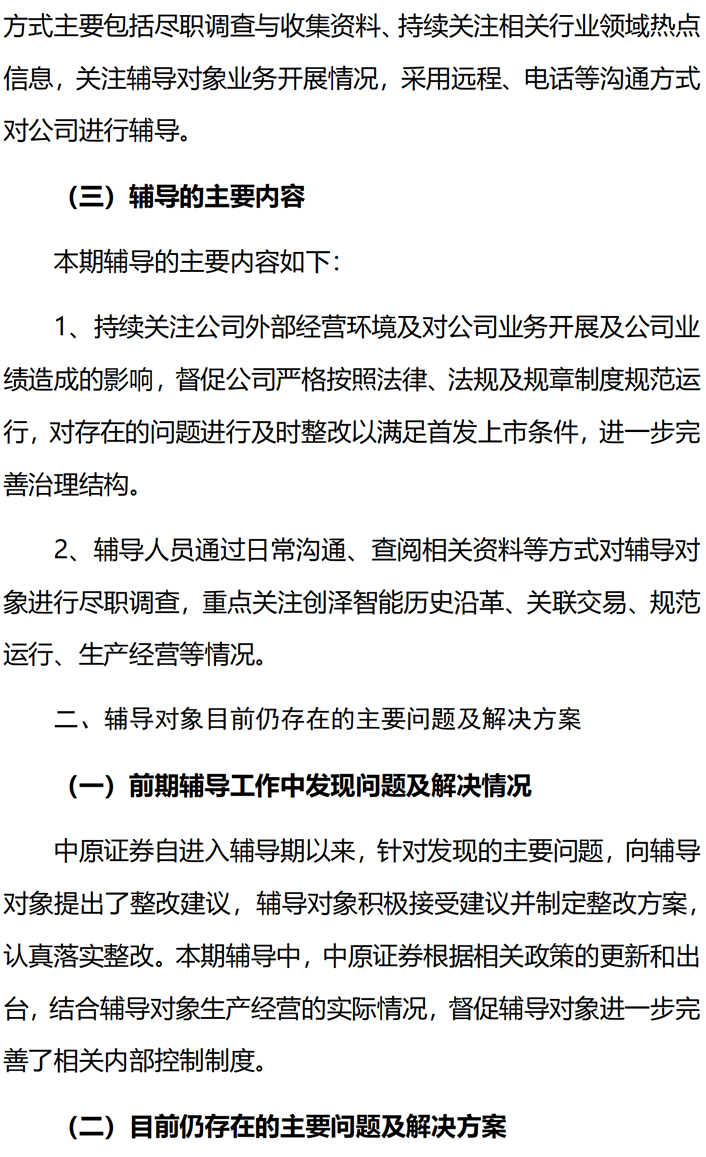 中原證券關(guān)于創(chuàng)澤機(jī)器人上市輔導(dǎo)內(nèi)容,對(duì)公司業(yè)務(wù)開(kāi)展及公司業(yè)績(jī)?cè)斐傻挠绊?督促公司嚴(yán)格按照法律,法規(guī)及規(guī)章制度規(guī)范運(yùn)行,關(guān)注創(chuàng)澤智能歷史沿革生產(chǎn)經(jīng)營(yíng)等情況